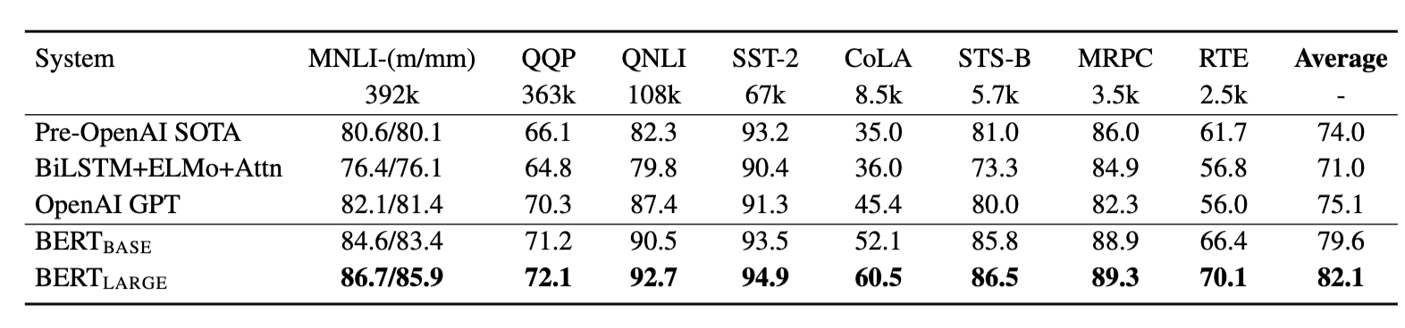 - -> 테스크를 위한 구체적인 구조 수정 없이도 하나의 아웃풋 레이어를 추가하는 것 만으로 다양한 태스크를 위한 SOTA 모델을 생성하는 것이 가능.