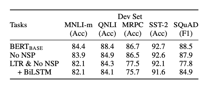 - LTR, No NSP : standard Left-To-Right LM + no NSP