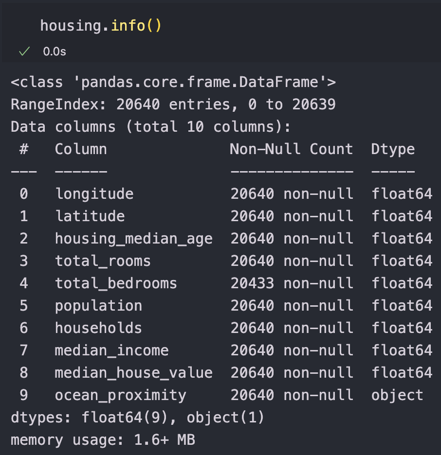 total_bedrooms는 20433개만 널값이 아니다. 즉, 나머지 207개는 이 특성을 가지고 있지 않다.ocean_proximity필드를 제외한 모든 특성이 숫자형이다.