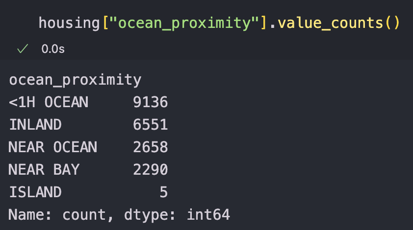 value_counts() 메서드는 어떤 카테고리가 있고, 각 카테고리마다 얼마나 많은 구역이 있는지 확인할 수 있다.